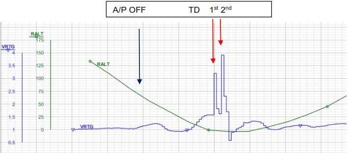 The first illustration below shows the approach vertical profile flown and the selected FMS vertical mode in use and, below the main diagram, the actual rate of descent and, where appropriate, the selected target vertical speed. The second illustration below shows the vertical profile and impact vertical acceleration around sea impact.