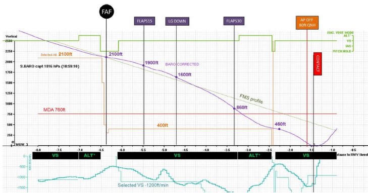 Passing 1800 feet QNH, the flaps were selected to 15° and the selected speed was 140 knots as the Captain confirmed “fully established” to TWR and the flight was cleared to land. On request from the First Officer, the Captain selected the landing gear down and was recorded telling the First Officer to “go, go to the limit". The selected rate of descent was progressively increased to 1800 fpm and flaps 30° selected. With 3.3 nm to go, the altitude capture mode engaged 400ft before the selected (400 feet) altitude was reached because of the commanded 1800 fpm descent. As 400 feet was approached with the indicated speed now reduced to 125 knots but the runway still not in sight, the Captain was recorded saying “we continue to 300” and the selected vertical mode was changed from the just-engaged ‘pitch hold’ back to V/S with a 1000 fpm rate of descent. The Captain said “keep on going” but passing 310 feet at 121 KCAS, the aircraft was still 2 nm from the runway.