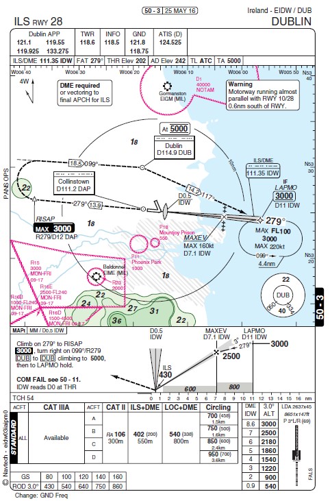 It was established that with the crew making the second flight of their four sector duty and the First Officer as PF the flight had been initially cleared by ATC to descend to 3,000 feet routing direct to waypoint ‘LAPMO’ (see the ILS approach chart below) and to contact Dublin Director for further instructions. On doing so, the flight was re-cleared to route direct to ‘MAXEV’ for an ILS approach to runway 28, descend to 2,000 feet and call established on the ILS LOC. En route to MAXEV, the flight was given a speed restriction of 190 KIAS so as to maintain separation from approach traffic 7.5 nm ahead in the approach and shortly afterwards instructed to reduce speed to 160 KIAS on reaching ‘MAXEV’.