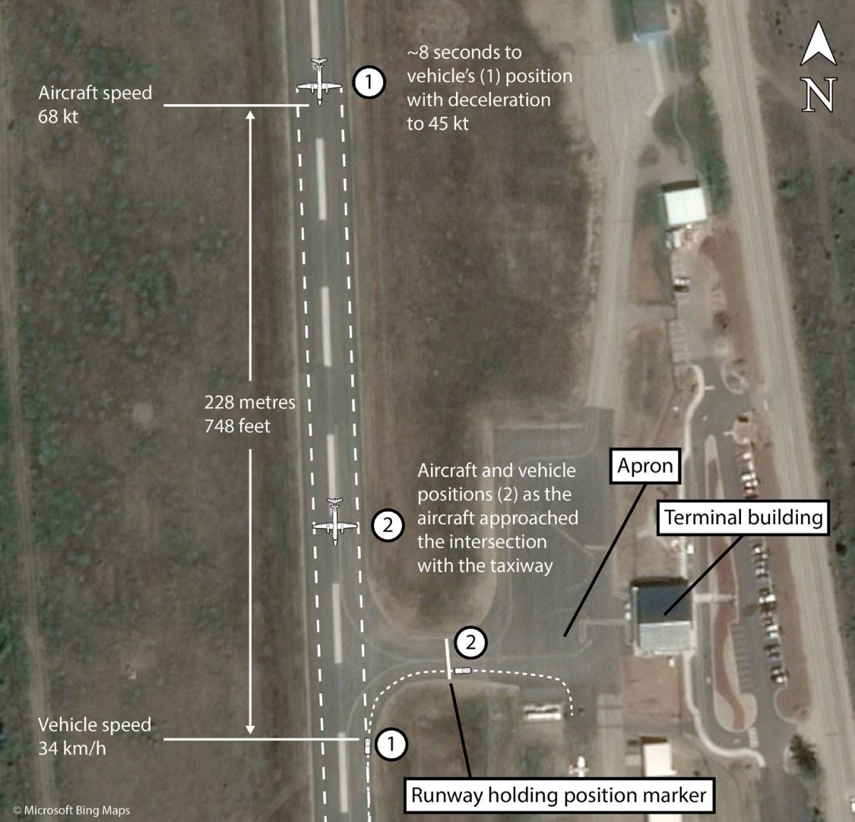 The Investigation found that the minimum separation between the landing aircraft and the pickup truck prior to it exiting the runway had been 228 metres and that the closing speed at the point the pickup truck was about to turn off the runway had been 63 knots - made up of the aircraft decelerating through 45 knots and the truck travelling at 18 knots.