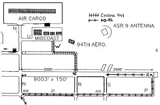 The Investigation found that radar vectors had been issued to three inbound aircraft to establish the landing sequence for runway 26R immediately prior to the collision. The first of these was a Continental Airlines DC-9 operating under call sign CO 9687 which was followed by the King Air and the 727, which subsequently collided. At this time, simultaneous ILS approaches were underway on runways 26R and 27L and take-offs were underway on runway 26L. At the time of the accident, access to runway 26L and clearance for take-off from it were the responsibility of the same TWR controller as was handling arrivals on runway 26R - the "North Local Controller".