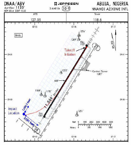 On 29 October 2006, a Boeing 737-200 being operated by ADC Airlines on a scheduled domestic passenger flight from Abuja to Sokoto crashed shortly after taking off from runway 22 in normal daylight visibility into developing adverse weather conditions without communicating with ATC. The aircraft was subsequently located nearby and found to have been destroyed by impact and fire which led to the death of 96 of the 105 occupants, major injuries to 2 others and minor injuries to the other 7. There were no ground casualties.