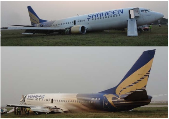 On 3 November 2015, a Boeing 737-400 (AP-BJO) being operated by Shaheen Air International on a scheduled domestic passenger flight from Karachi to Lahore as NL-142 landed off an unstabilised non-precision approach at Lahore in day IMC and both main landing gear assemblies collapsed as it departed the side of the runway. An emergency evacuation followed and none of the 121 occupants were injured during the excursion or the subsequent evacuation but the aircraft sustained extensive damage.