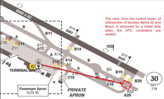 - A controller seated at either the GND or TWR positions, is prevented from seeing taxiway 'A20' and the lead-on to taxiway 'B' by one of the metal strips which separate the window panes.
