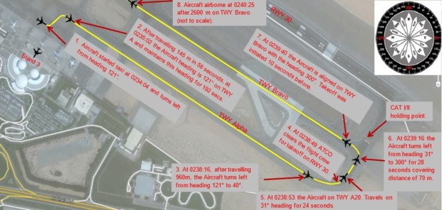 The formal statement of Cause of the event was that "most probably, the flight crew did not devote sufficient attention to the taxi route, or taxi route lighting and signage" and that "the flight crew misunderstood the air traffic control instructions and failed to identify that the aircraft had been aligned on a taxiway, instead of on the runway, resulting in a take-off from the taxiway".