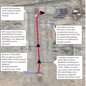 Main gear touchdown on the 2,170 metre-long 30 metre-wide runway occurred at 146 KIAS and 350 metres beyond the runway threshold. Deployment of the thrust reversers to idle was made immediately but achieved with slight asymmetry, the left engine reverser deployment lagging 3 seconds behind the right resulting in a small drift to the right of 2° to which the response was a 5 second left-side-only brake application. Full thrust reversers were deployed and manual braking began once the nose landing gear was down but this did not occur until 900 metres past the threshold. However, this left only 1,270 metres of runway ahead and the initially applied brake pressure represented no more than low to medium rather than maximum. As it became clear that the aircraft would not have slowed down sufficiently by the time the end of the runway where the exit taxiway was located was reached, brake pressure was increased to maximum. As the end of the runway paved surface was crossed at a slow speed onto soft ground, the aircraft was steered to the right and stopped parallel to and 10 metres to the left of the exit taxiway (see the illustration below). There were no indications of fire and the Captain did not order an emergency evacuation. External steps were brought to the right front door of the aircraft and the occupants were disembarked. The aircraft was then removed from the soft ground by towing it backwards using cables attached to both main landing gears as no suitable tow bar was available at the airport and once back on the paved surface, the undamaged engine No 2 was started and it was taxied to the parking area.