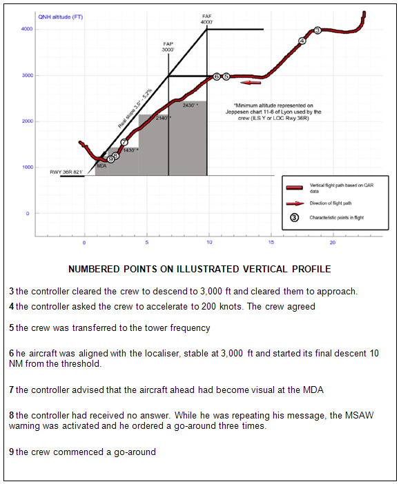 On 7 September 2010, a Turkish operated Boeing 737-400 flew a non precision approach at Lyon Saint-Exupéry in IMC significantly below the procedure vertical profile throughout and only made a go around when instructed to do so by ATC following an MSAW activation. The minimum recorded radio height was 250 feet at 1.4nm from the runway threshold.