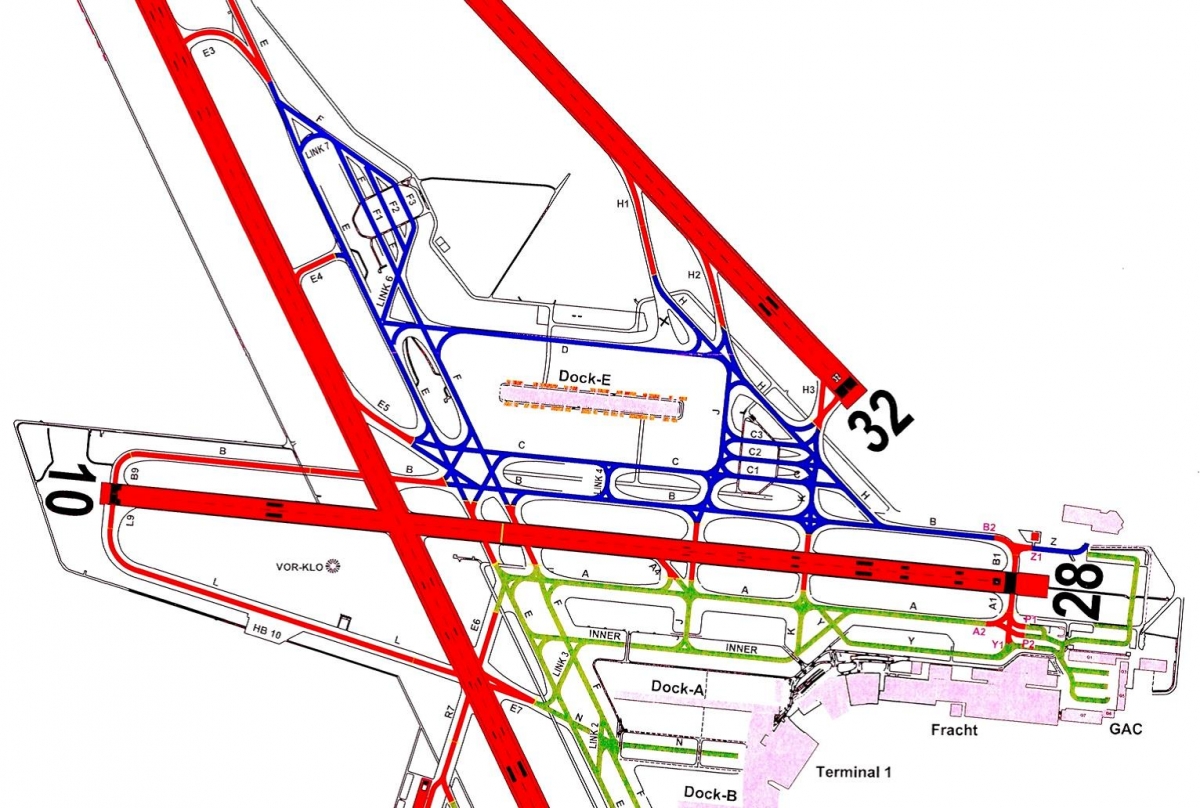 It was established that, after a normal landing on runway 34, the crew had checked in with 'Zurich Apron' on transfer from TWR whilst moving slowly at the intersection of taxiway E3 and taxiway E (see the diagram below). They had then received and correctly acknowledged an instruction to "taxi via Foxtrot and Charlie to stand Echo two six." The aircraft moved onto taxiway F, following the taxiway signs and continued past de-icing lanes F1 and F2 maintaining an appropriate speed of appropriately 10 knots.