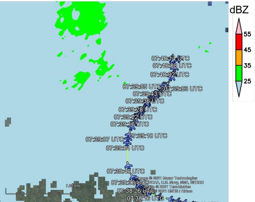 The aircraft ground track annotated with times (the green area represents light rain). [Reproduced from the Official Report]