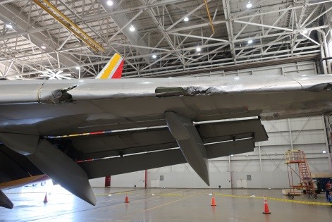 Overall, collateral impact damage to the airframe attributable to the ejected debris was assessed as “significant” and was evident on the left wing leading edge (see the illustration below), the fuselage side and on the left horizontal stabiliser. It was also subsequently found that although the fan case had not been penetrated from the inside, it did have a hole that corresponded to a fan blade impact mark.