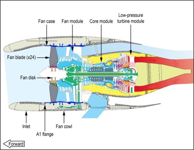 The fan blade involved, one of 24, was found to have failed where at its dovetail join with the fan disc. In addition to the design of fan blades and their mountings inside the fan case, various manufacturing processes are also employed to reduce the vulnerability of blades to residual stress, to reduce surface erosion and to limit fan blade radial movement in normal operation. The latter helps to ensure that the axial (longitudinal) forces which might occur in the event of bird ingestion or a single FBO event will be transmitted to the hub and minimise their consequences. On the CFM56-7B, the engine inlet is attached to the fan case by 24 fasteners and consists of inner and outer barrels and an aerodynamic lip to create efficient airflow into the fan.
