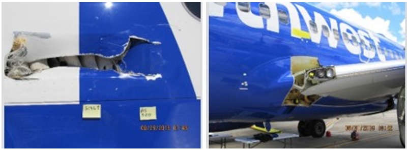 A detailed examination of the aircraft found that the left side fuselage hole (see below) measured 40 cm horizontally and up to 13 cm vertically and was located just below the cabin windows at seat rows 11/12 but no corresponding damage was visible to the interior cabin sidewall. Evidence of other debris impact damage was visible “on the left side of the fuselage, the left wing and the left horizontal stabiliser and the left winglet front spar was partially severed”.