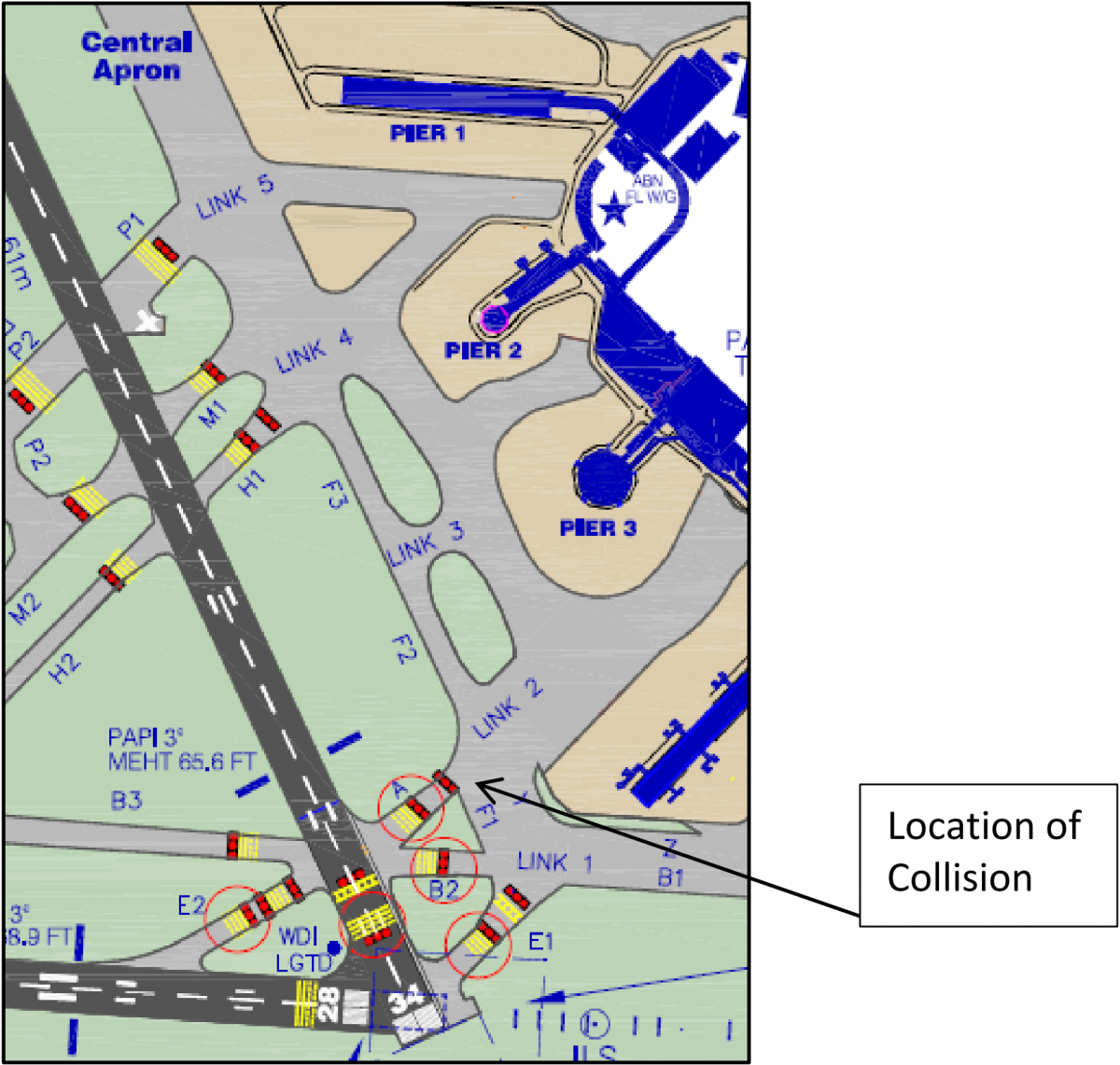 The Investigation reviewed the history of the F1 taxiway which had until 2010 been a direct continuation of F2 but at that point had been moved to the west and joined by the parallel taxiway Y with both accessed via a complex chicane system at each end. The effect of this redesign, which had produced the layout and taxi restrictions in place at the time of the collision, was to reduce the length of taxiway F1 to 20 metres. It also had the effect of reducing the distance prior to the beginning of F1 for an aircraft stopping clear of it when approaching from LINK 2 to less than that required to provide sufficient clearance for a 737-800 or a larger wingspan aircraft to pass behind when moving from LINK 2 to TWY A. It was noted that "visiting foreign pilots regularly sought additional routing information from ATC when taxiing within the vicinity of LINK 1/LINK 2" and that even pilots regularly using and therefore familiar with the LINK 1/LINK 2 taxiway system considered it "to be complex and that the designations are confusing compared to other airports".