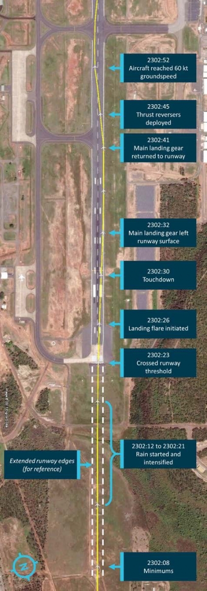 During the excursion, the Captain recalled having heard “a repeated light thudding noise” which prompted him to ask the First Officer if they had hit the runway lights and was advised that they were just missing them. Since the aircraft nose was oriented to the left of the direction of travel, the front of the aircraft was within the painted runway edge markings making this assessment difficult. The First Officer later reported having felt “a shudder, as though the wheels were skidding” and both pilots later commented that “the physical sensation and noise were not as strong as they would have expected from the wheels departing the runway”. Both Melbourne-based pilots also stated that they were familiar with operations into Darwin with the most recent landings there in the case of both pilots having been at night. The Captain also stated that he had only seen rain conditions there like those which had affected the final stages of the investigated approach once, about 30 years previously and the First Officer said that he had never seen such conditions there before.