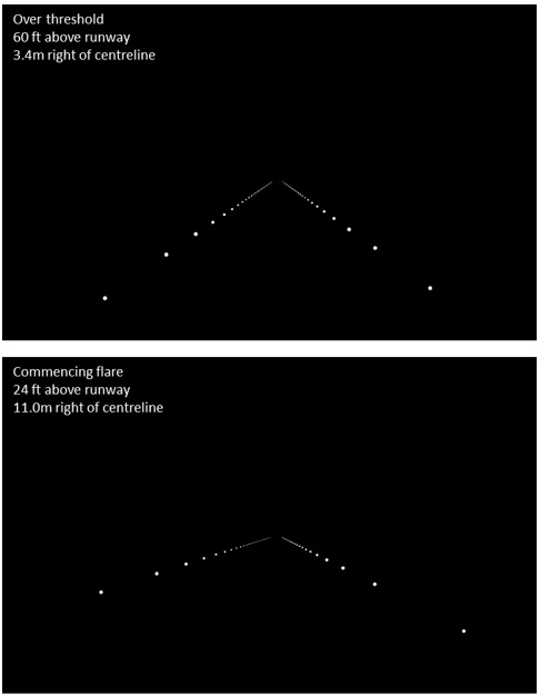 This prompted the Investigation to conduct a simple simulation of the edge lights as they would have been seen by the Captain by using a simple model representative of the prevailing night visual conditions. As illustrated below, this demonstrated that the 3.4 metre deviation from the centreline at 60 feet agl would have been “almost undetectable” and that the 11 metre deviation at 24 feet agl would have been “inconspicuous”. The model was also used to show that the addition of centreline lighting would have materially improved the ability to detect the deviation at both points and that this improvement had centreline lighting been available would have been equally true with a 6° bank angle.