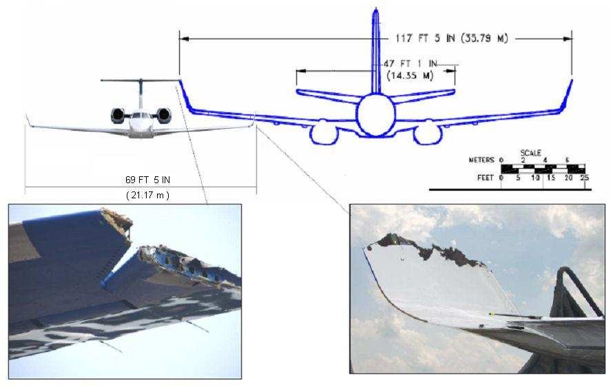 Reconstructed collision geometry and the resultant damage - the Embraer left winglet struck the 737 left wing & its left horizontal stabiliser/elevator was then struck by the 737 left winglet. [Reproduced from the Official Report]