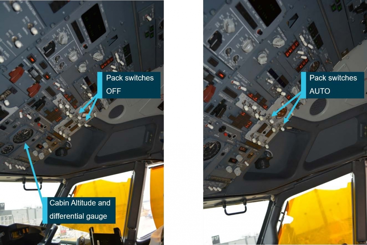 It was noted that the air conditioning and pressurisation system panel was in its ‘usual’ location above the First Officer’s position and that the view of position selected on the three-position pack switches for a pilot seated on the left hand side may be inadequate unless the occupant moves specifically to view them, since their view is a sideways one of switches which are routinely selected between the up (OFF) to the centre (AUTO) position or occasionally to the lower (HIGH) position (see the illustrations below).