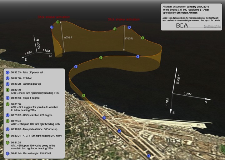 On 25 January 2010, a Boeing 737-800 being operated by Ethiopian Airlines on a scheduled passenger flight from Beirut to Addis Ababa in night Instrument Meteorological Conditions (IMC) disappeared from ATC radar soon after departure from Runway 21 and was subsequently found to have impacted the sea in an unintentional out of control condition some five miles south west of the airport less than five minutes after getting airborne. Impact resulted in the destruction of the aircraft and the death of all 90 occupants.