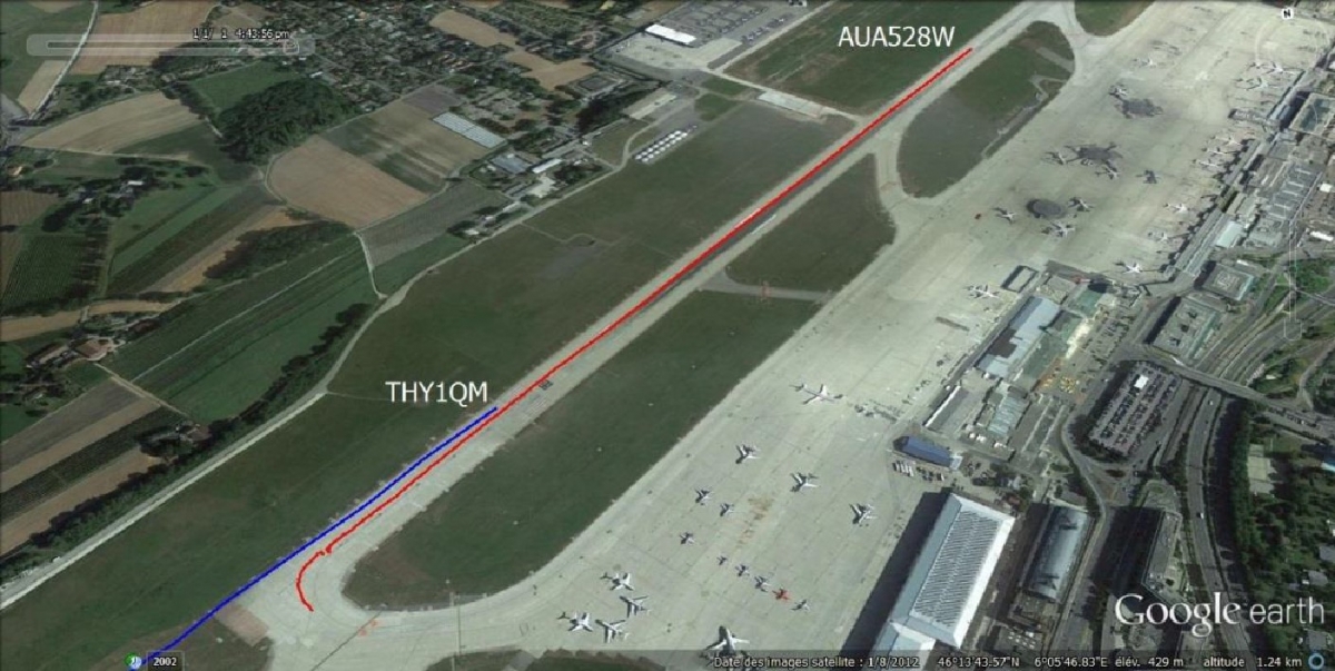 On 31 March 2014, a Boeing 737-800 (TC-JGV) being operated by Turkish Airlines on a scheduled passenger flight from Istanbul Atatürk to Geneva as THY1QM in accordance with ATC instructions touched down on runway 05 at destination three seconds after a Fokker 100 (OE-LVL) being operated by Tyrolean Airlines on a scheduled passenger flight for Austrian Airlines from Geneva to Vienna as AUA 582W had taken off from the same runway. Separation between the two aircraft along the runway was reduced to just over 50% of the prescribed minimum of 2,400 metres.