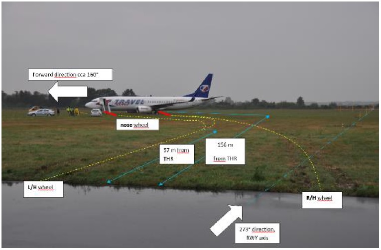 The aircraft as finally stopped showing its deviation to the left of the extended runway centreline to avoid the 09 approach lighting after leaving the end of the paved surface [Reproduced from the Official Report]