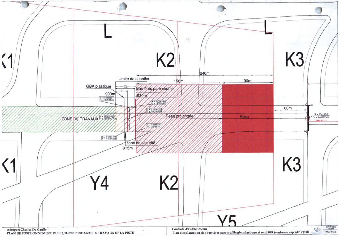 “The RESA, ninety metres long in accordance with international standards, started sixty metres after taxiway K3, thus making a clear area of 150 m. It was separated from the extended RESA, 150 metres long, by a separator made up of fifty-five red or white polyethylene markers (marked ‘GBA’ on the diagram). These markers were positioned about sixty metres from the centre line of taxiway K2 and placed in such a way as to alternate the white and red colours. They were weighted with water and linked by a connecting part clad in a reflecting strip visible over 360°. Each marker measured 1.25 metres long, 0.55 metres wide and 0.80 metres high. A blast fence 2.44 metres high, fitted with a lighting system with eleven red lights separated the extended RESA from a zone, about 36 metres wide provided for the use of works traffic. The works zone then stretched for a length of about 900 metres.”