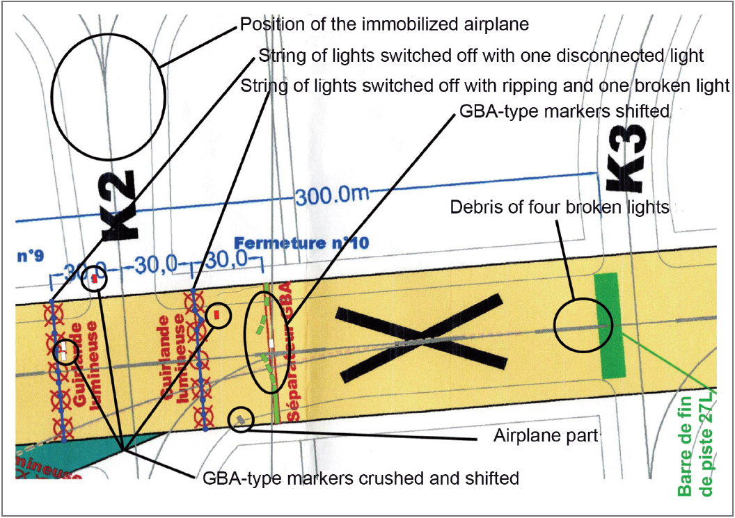 At the time of the incident, the final 1240 metres of the 4200 metre long runway 27L were out of use to allow construction work to proceed. The TODA and ASDA were respectively 2960 metres from the beginning of the runway, 2640 metres for a line-up at Y12 and 2360 metres for a line-up at Y11. The “provisional end of runway 27L was defined by a line of nine unidirectional red lights” and prior to the provisional end of runway 27L and after a ‘works zone’, a Runway End Safety Area followed by an extended RESA had been defined, which together had a length of 240 metres and a width of 120 metres.