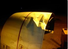 Damage sustained by the aircraft engine indicated that the buffalo had hit the inner (fuselage) side of the engine at the 7 to 8 o'clock position of the inlet circumference as viewed from the front and the effects of impact had been transmitted longitudinally (see the photographs below). Within the engine, there was damage to 9 fan blades. It was considered that the nature of this damage indicated that the animal had already been on the runway when the aircraft had begun its take-off roll. It was noted that the chances of either pilot seeing it may well have been reduced by the 'night blind spot effect', the occurrence of a central 5-10° cone of reduced visual acuity which may mean an object ahead my go undetected or if detected may fade away.