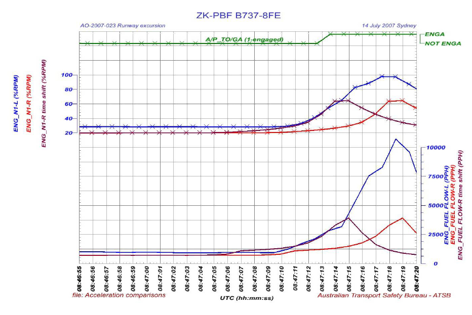 “High bypass turbo-fan engines of the type found on modern Boeing 737 aircraft do not accelerate in a linear manner when thrust is increased. The rate of acceleration increases as N1 increases (Figure 4), which was demonstrated by the characteristics of the engines during the acceleration sequence in this incident. The FDR readout depicts an expanded 25-second period across the engines’ thrust changes, showing recorded values of engine fuel flow and fan speeds, comparing the acceleration characteristics of the engines from idle. The red lines depict the characteristics of the right engine that commenced accelerating from an idle N1 setting. The blue lines depict the characteristics of the left engine that commenced accelerating from a higher initial N1 setting. The brown lines represent the acceleration of the right engine, moved 4 seconds earlier in the sequence, so that they overlay the acceleration phase of the left engine, to assist in making a comparison between the individual engines’ performance characteristics while accelerating.