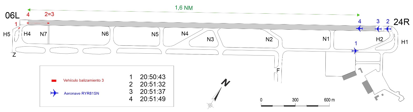 The airport was using runway 24R for both arrivals and departures and with the GND controller about to go off duty, the GND position was about to be closed and merged with the TWR position with the TWR controller taking over both. Following completion of its pushback, the departing Boeing B737-800 requested taxi clearance from the GND controller and was cleared via position ‘F’ (see the illustration below) to the holding point for 3270 metre-long runway 24R (also referred to locally as the ‘north runway’) and subsequently to call on the TWR frequency “when ready”. The GND and TWR controllers then prepared for the planned integration of the two positions and their frequencies at the TWR position which then took place just over a minute later.