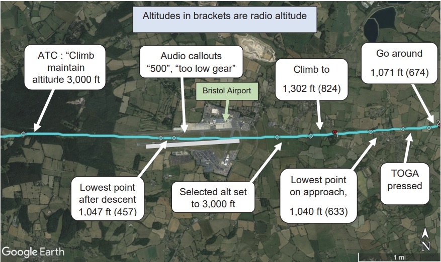 An annotated ground track of the initial part of the go around. [Reproduced from the Official Report]