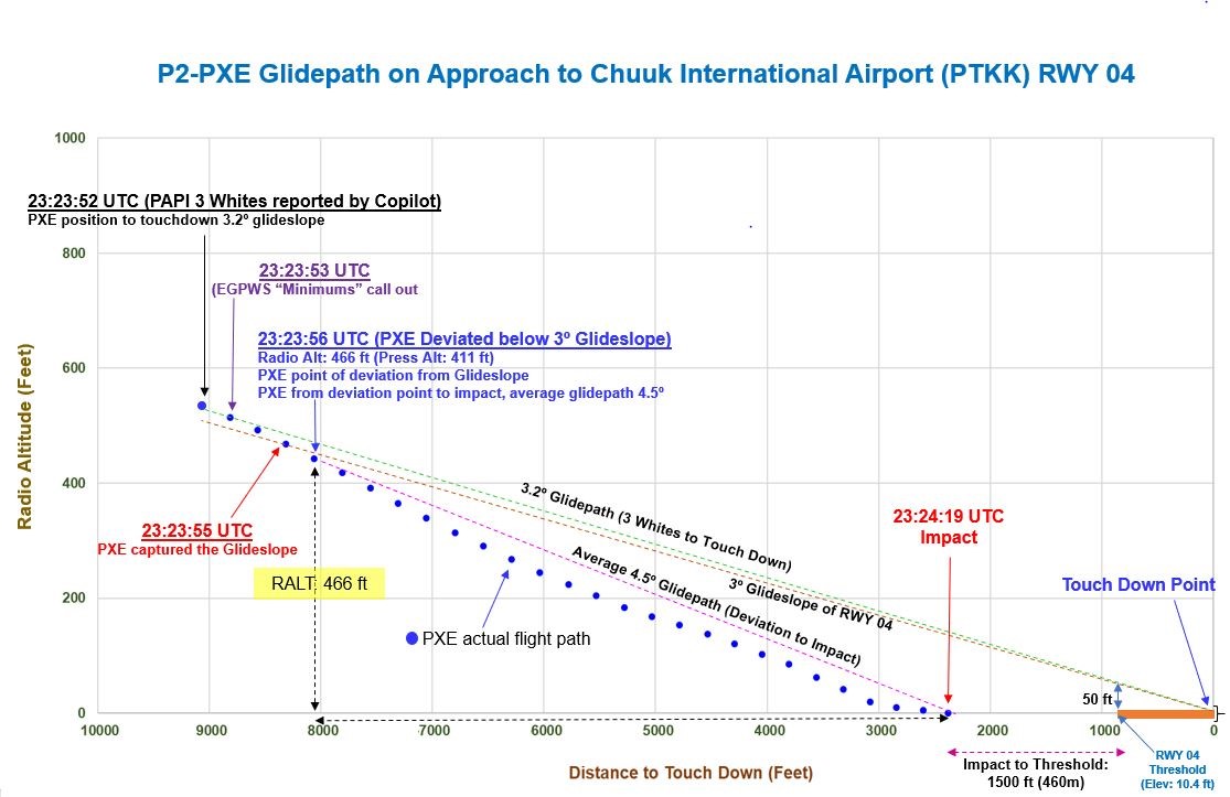 - Prior to entering the area of heavy rain, the First Officer called “three whites” showing on the Chuuk runway 04 PAPI at the MDA indicating that the aircraft was slightly high on the glideslope. The aircraft vertical profile to impact was an average of 4.5° and was flown in excess of 1,000 fpm in IMC.
