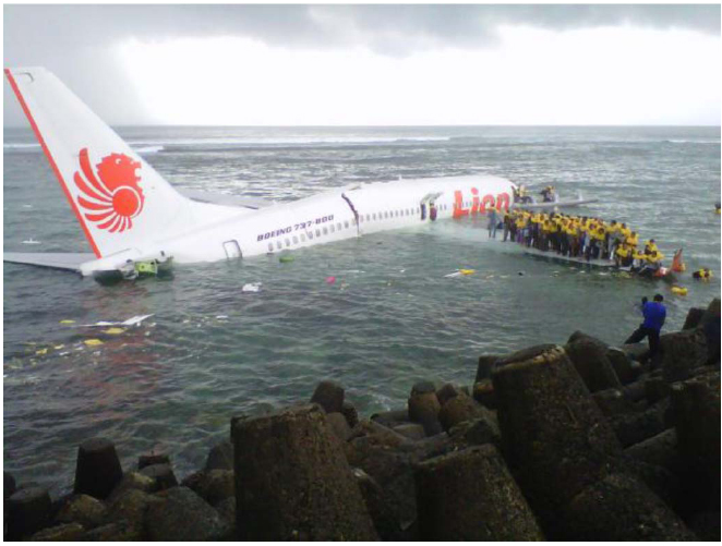 On 13 April 2013, a Boeing 737-800 (PK-LKS) being operated by Indonesian carrier Lion Air on a scheduled domestic passenger flight from Bandung to Denpasar, Bali as LNI 904 crashed into the sea just short of runway 09 at destination after making a non precision approach and continuing it into Instrument Meteorological Conditions (IMC) below MDA. The aircraft wreckage remained in shallow water near the shoreline and there was no fire and all 108 occupants were rescued with only four sustaining serious injury.