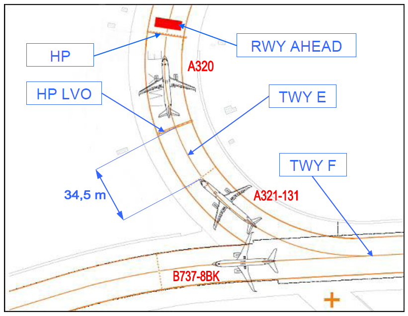 The diagram below taken from the Investigation Report shows the stopped position of the A321 at the time of the collision with the 737 passing behind.
