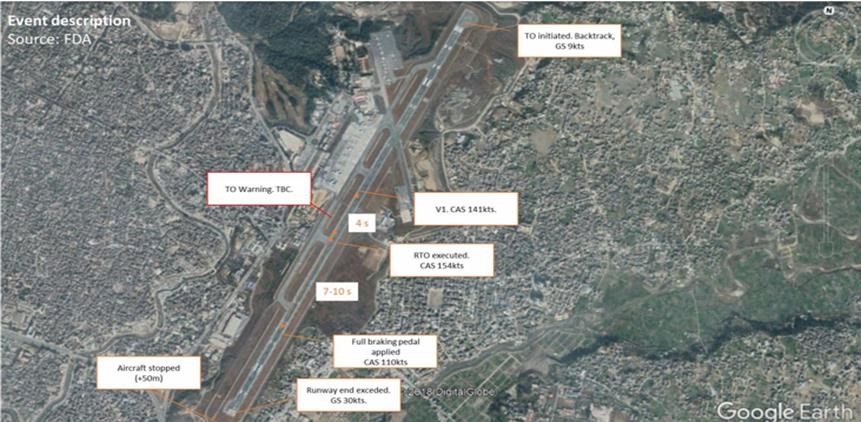 On 19 April 2018, a Boeing 737-900 made a high speed rejected takeoff at Kathmandu in response to a configuration warning and overran the runway without serious consequences. The Investigation found that when a false Takeoff Configuration Warning caused by an out of adjustment switch had been annunciated just after V1, the Captain had decided to reject the takeoff because of concerns about the local terrain and locally adverse weather. It was noted that the aircraft operator did not provide criteria for rejecting takeoff up to or above the 80 knot crosscheck but that the Boeing reference QRH did so.