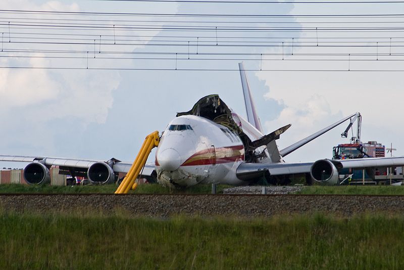 On 25 May 2008 a Kalitta Air B747-200F, which was departing Brussels on a cargo flight to Bahrain, overran Runway 20 at Brussels Airport, Belgium during a rejected take-off. The aircraft came to a stop 300m beyond the end of runway 20 and broke into three parts. The crew of four and one passenger safely evacuated from the aircraft and suffered only minor injuries.