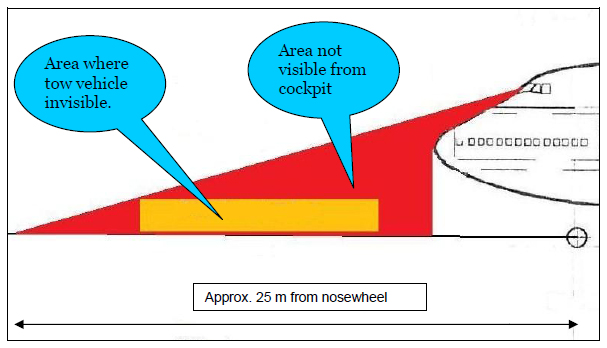 An Investigation was carried out by the Swedish Accident Investigation Board. It established that the aircraft, with the First Officer as PF and in full control, had begun to taxi in a right hand turn before an ‘all-clear’ signal had been given by the supervising dispatcher to indicate that the ground crew and their vehicle were clear. It was noted that, at the time the taxi was commenced, the disconnected tow vehicle was not yet far enough away from the aircraft for it to be readily visible from the flight deck. The diagram below taken from the official report shows the tow vehicle as it was positioned in yellow and the approximate area ahead of the aircraft which would have been invisible to the occupants of the flight deck in their normal positions in red – the forward end of this red triangle was identified as being about 25 metres ahead of the nose landing gear.