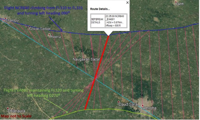 On 22 December 2018, a Boeing 747-400 BCF (919CA) being operated by National Air Cargo on an international cargo flight from Bagram to Hong Kong as NCR840 deviated from its clearance to fly level at FL310 at night in unrecorded flying conditions and separation was lost against an opposite direction Boeing 777-300 being operated by EVA Air on a scheduled international passenger flight from Bangkok to Vienna as EVA061 and a same direction Boeing 777-300 being operated by KLM on a scheduled international passenger flight from Amsterdam to Bangkok as KLM875. The minimum separation occurred between the manoeuvring 747 and KLM 777 which reached the same altitude when only 1.84 nm apart.