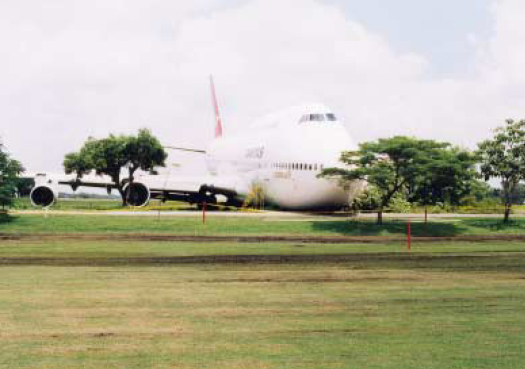 On 23 September 1999, a Boeing 747-400 being operated by Qantas on a scheduled passenger service from Sydney Australia to Bangkok overran Runway 21L during an attempted night landing in normal visibility and came to a halt substantially intact 320 metres beyond the runway end. There was no fire and a precautionary evacuation of the aircraft was not begun until 20 minutes after it came to rest. Only minor injuries were sustained by 38 of the 410 occupants, some during the initial runway excursion, others as a consequence of the evacuation. The aircraft remained substantially intact during the overrun although the nose landing gear and one main landing gear separated. The picture below, taken from the Official Accident Report, shows the aircraft in its final stopping position.