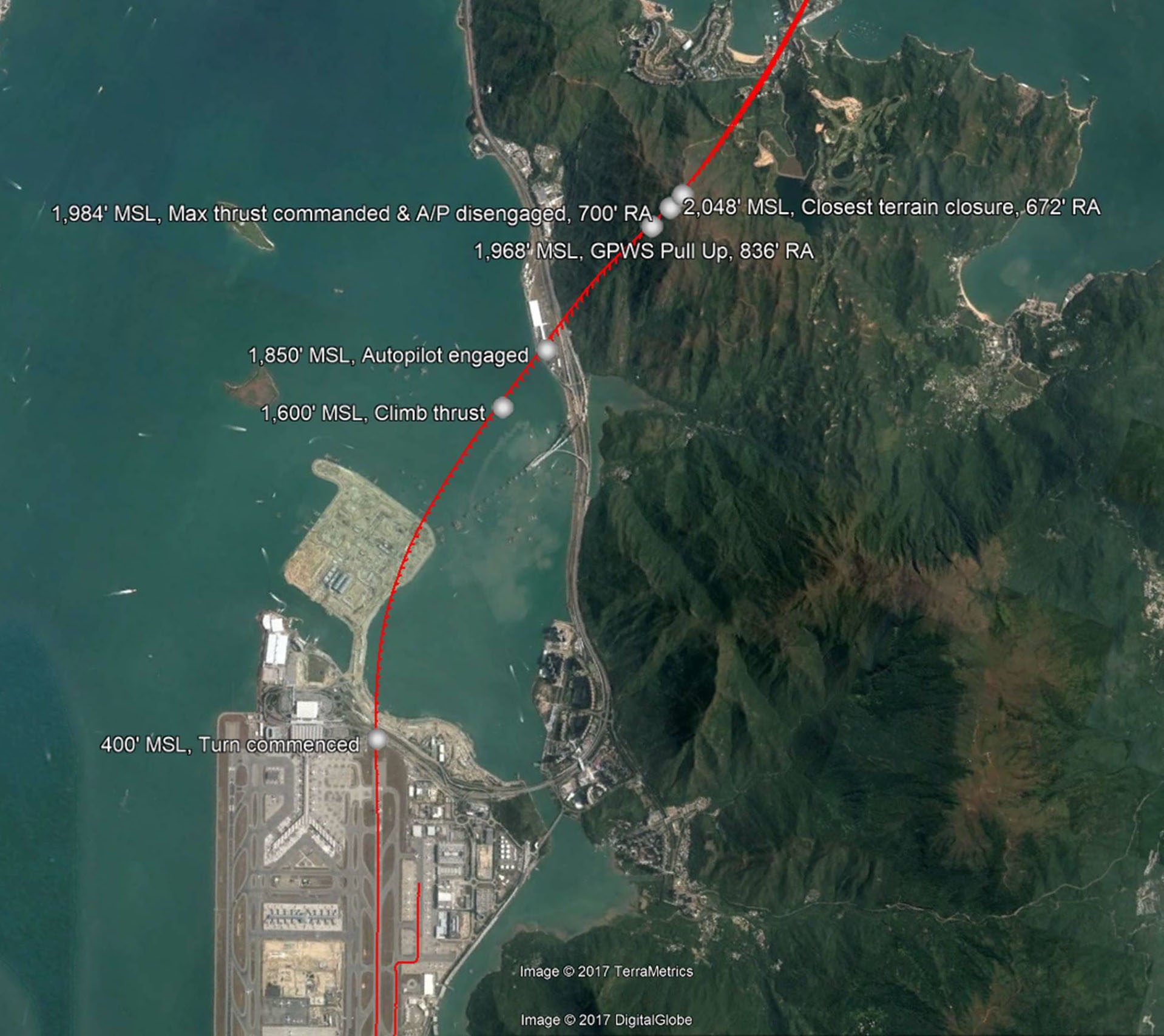 Once the aircraft became airborne, the almost immediate commencement of a right turn towards the first active waypoint, PORSH did not lead to any crew response and climbing through approximately 1,800 feet QNH, the Captain asked the PM to select AP1 to command as the aircraft continued towards the high ground at Lo Fu Tau. ATC then informed the flight that it was off track and instructed it to turn left to resume the SID and the Captain began to make a HDG Select change whilst leaving VNAV mode engaged. Soon afterwards, ATC advised the flight of terrain to the right of the aircraft and instructed it to expedite the climb to 5,000 feet QNH. Almost immediately, an EGPWS ‘TERRAIN, TERRAIN PULL UP’ (Mode 2A) Warning occurred and the Captain immediately disconnected the AP “and increased pitch and thrust”. The aircraft subsequently passed over the terrain with a clearance of approximately 670 feet and subsequently re-established on the SID track and continued without further event. It was noted that no other air traffic was affected by the track deviation which is depicted in the illustration below.