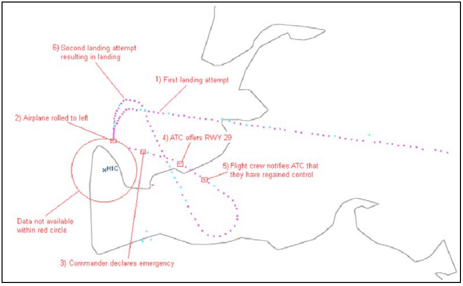 It was noted that "three minutes and 22 seconds after the initial upset, the flight crew contacted ATC and advised that they had regained control". Preparations were made for a further approach to runway 20 and, after discussing the upset and concluding that it had to do with the flight controls and that it had occurred when the flaps were fully deployed, it was decided that only 15° flap would be used. The crew requested that a trauma team should meet the passengers after arrival. The track of the aircraft during the event is shown on the diagram below.