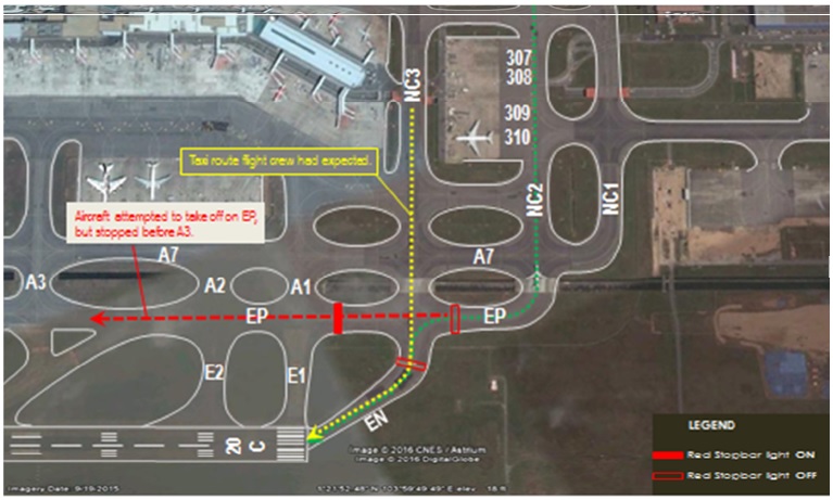 - The First Officer "seemed to have been so fixated that he missed the red stop-bar lights on EP at the EP/E1 intersection and the fact that there were still green lights ahead for him to follow that would have guided him to turn left onto EN".