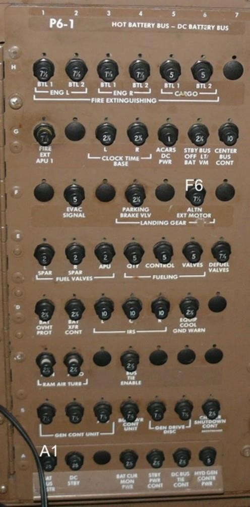 Visual inspection of the flight deck by investigators shortly after the accident found that the C829 BAT BUS DISTR circuit breaker situated at the inboard base of the P6-1 CB panel (see the illustration below) situated behind the Captain’s seat was tripped. An exhaustive examination and function testing of all systems and components whose malfunction could have caused the C829 CB to trip subsequently found no abnormalities and the CB itself was found to operate correctly. This 25 amp-rated CB controls the power to 13 subsidiary ones which then individually protect various emergency systems which included the 7½ amp rated CB protecting the Alternate Gear Extension Motor needed for Alternate or free fall gear extension to work.