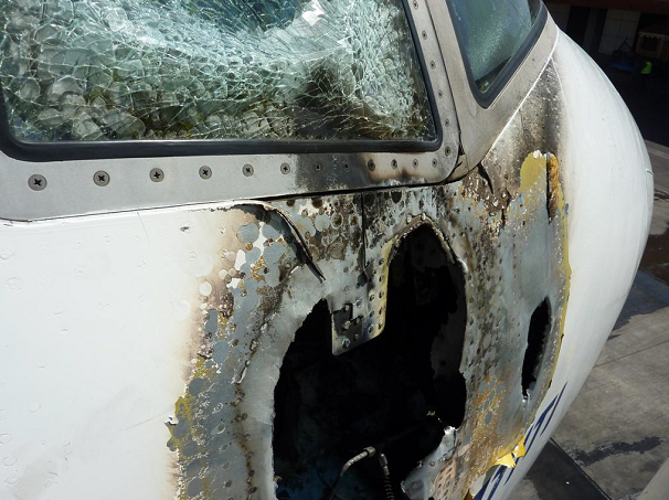 Damage to the aircraft was mainly obvious internally where the flight deck was completely burned out by the intense fire - see the picture below - but also included two holes burned through the aircraft external skin just below the First Officer’s window, - see the second picture below - as well as smoke damage throughout the aircraft and heat damage on overhead structures well aft of the cockpit.