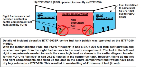 - The cause of the overfuel situation was that the B777-200ER aircraft involved was erroneously recognised as a B777-200 version by the FQIS owing to a fault in the Program Switch Module (PSM) which had resulted in the readings of the eight sensors within the mid-section of the centre fuel tank not being included in the fuel load computed by the aircraft FQIS. The nature of the fault in the PSM could not be established.