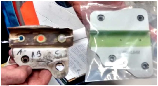 The recovered broken bracket (left) compared with the thicker ‘enhanced design’ bracket (right). [Reproduced from the Official Report]