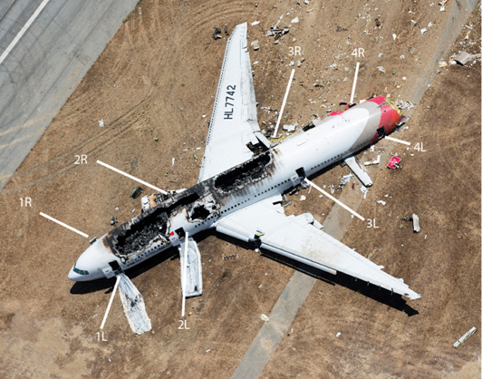 The remains of the fuselage showing the eight exits used in the evacuation (Source: NTSB)