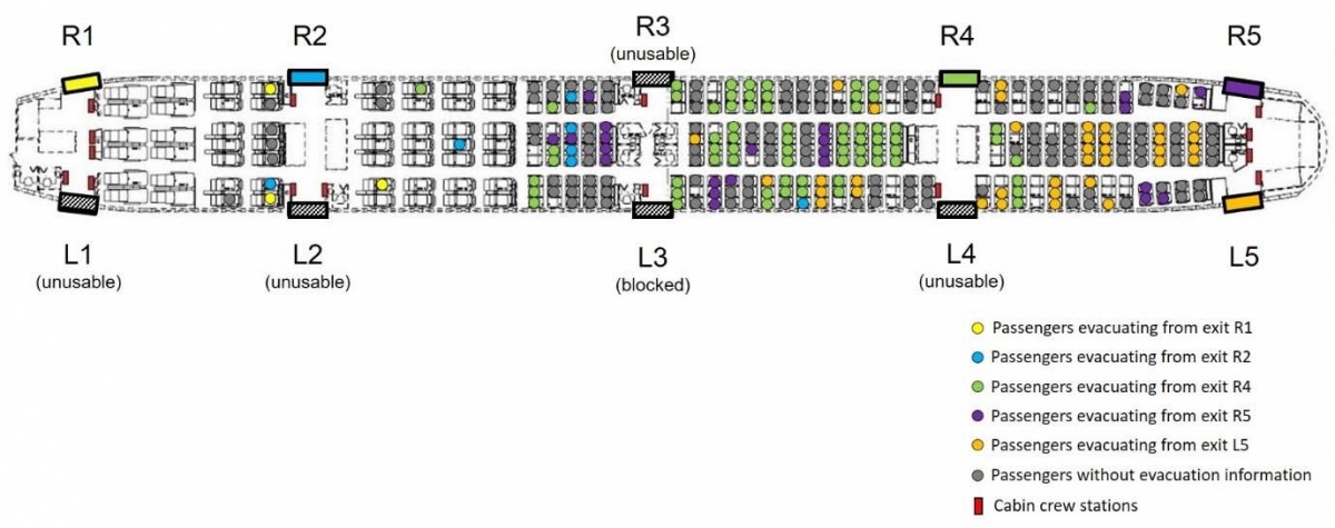 On receipt of the evacuation command, all but one of the 10 passenger cabin emergency exits were initially opened but only 5 of them were ultimately useable. Smoke and fire outside prevented the use of the two over wing exits at L3 and R3 and the slides at three other exits were not used - the L1 slide detached from the aircraft when deployed and the slides at L2 and L4 could not be not used because the wind blew them up against the door. A questionnaire to passengers was subsequently used by the Investigation to map the use of the available exits (see below).