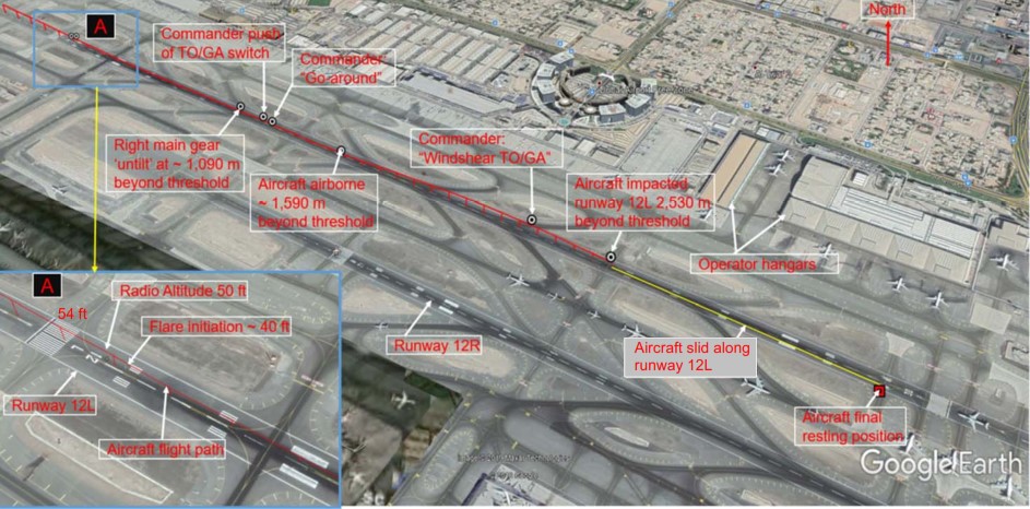 On 3 August 2016, a Rolls Royce Trent 892-powered Boeing 777-300 (A6-EMW) being operated by Emirates on a scheduled international passenger flight from Trivandrum, India to Dubai as EK 521 commenced a go around shortly after touchdown on runway 12L at destination in day VMC but almost immediately sank back onto the runway and veered to the right towards its end before stopping. All 300 occupants escaped but four of the cabin crew were seriously injured and 21 passengers, 6 cabin crew and one of the pilots sustained minor injuries. The aircraft was completely destroyed by a combination of impact damage and the fire which developed quickly thereafter and eventually culminated in an explosion. This explosion occurred after the evacuation of all 282 passengers and most of the 18 crew had been completed. One fire fighter was killed, and five others and two police officers sustained minor injuries at the crash site. Damage was caused to the runway surface and to manoeuvring area lighting and signage.