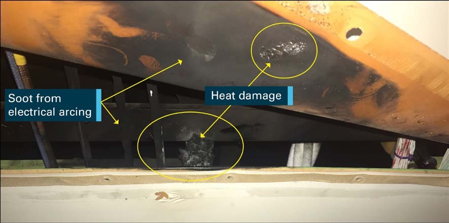 - even though there was a significant amount of soot and electrical arcing, de-energising the electrical circuit manually before sufficient current went to ground negated the Electrical Load Control Unit from tripping.