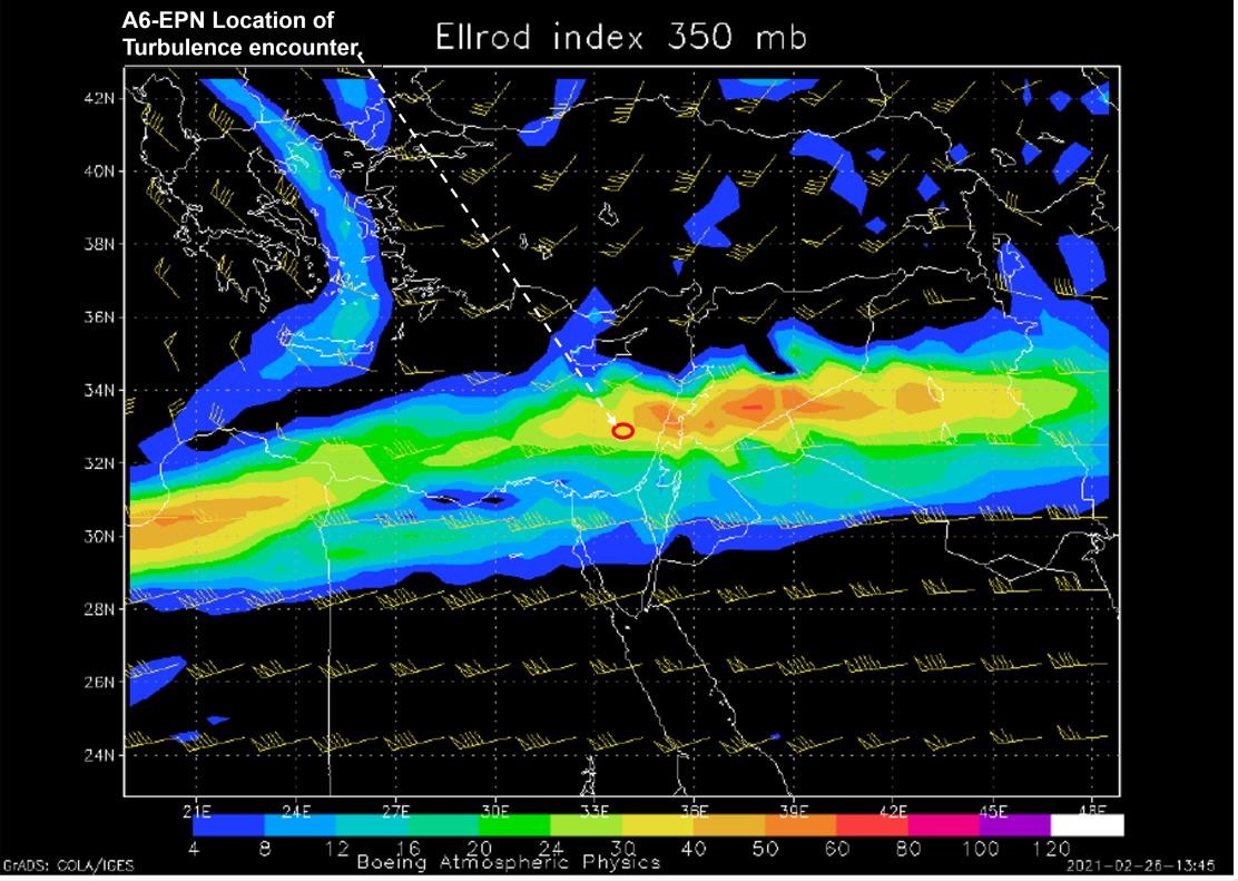 Boeing provided an analysis of the atmospheric conditions which it was likely had been affecting the aircraft at the time of the CAT encounter based on satellite images, atmospheric sounding, radio frequency lightning triangulation, convective available potential energy and Ellrod Index. The latter is used to assess turbulence potential attributable to wind shear along jet streams and weather fronts. An Ellrod Index mapping of the area where the aircraft was is shown below with the exact location where severe turbulence occurred marked. This location was in an area with an Ellrod value above 30 and next to one with a value above 50, which Boeing atmospheric physicists advised is capable of producing strong turbulence. Modelling indicated that the jet stream had reached speeds of about 170 knots just to the south and above the location of the aircraft.